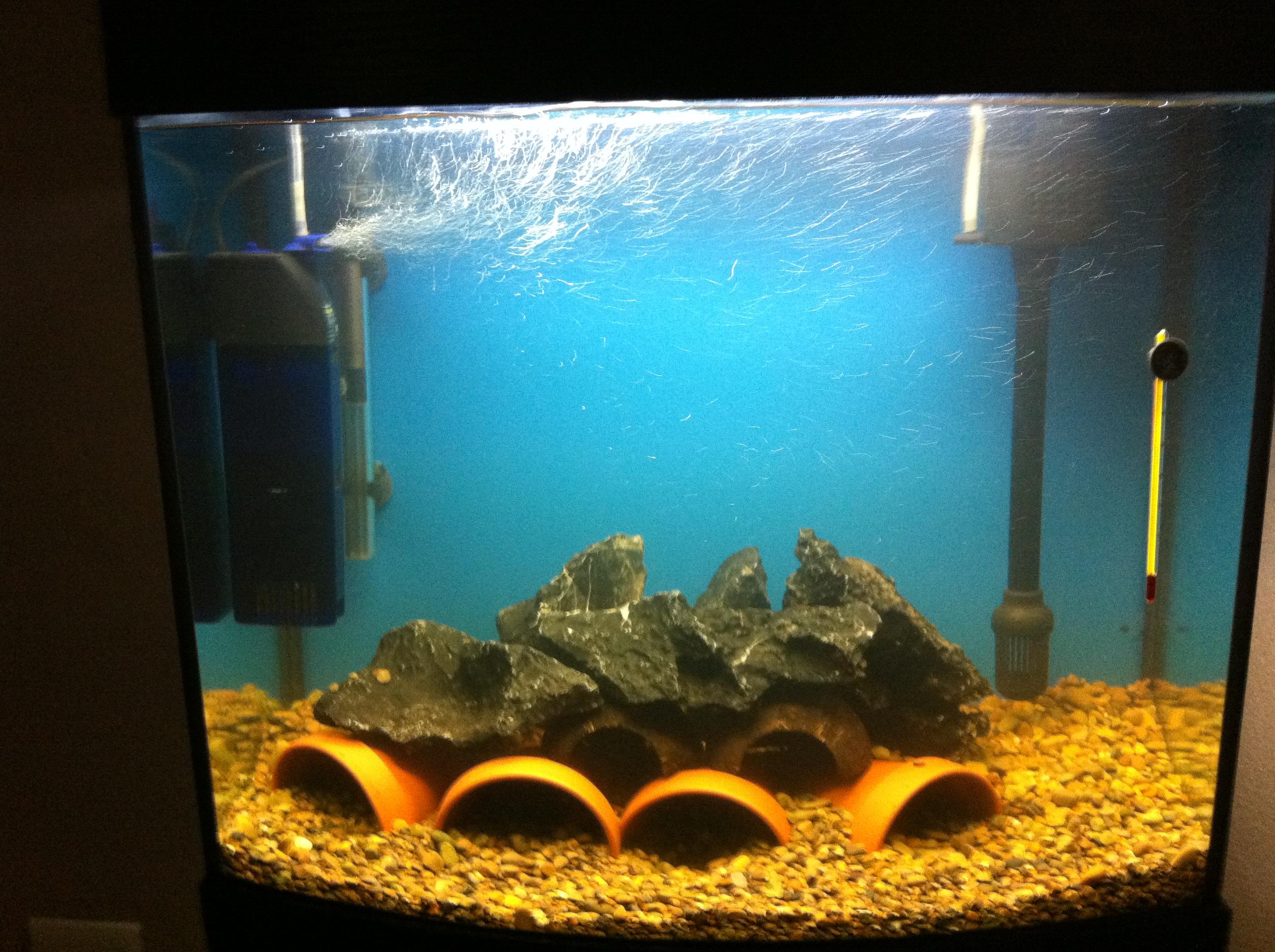 Have a look at my tank setup and let me have your thoughts. My zebs has been in the tank for 2 days now, but instead of hiding in the caves they are hiding under the rocks