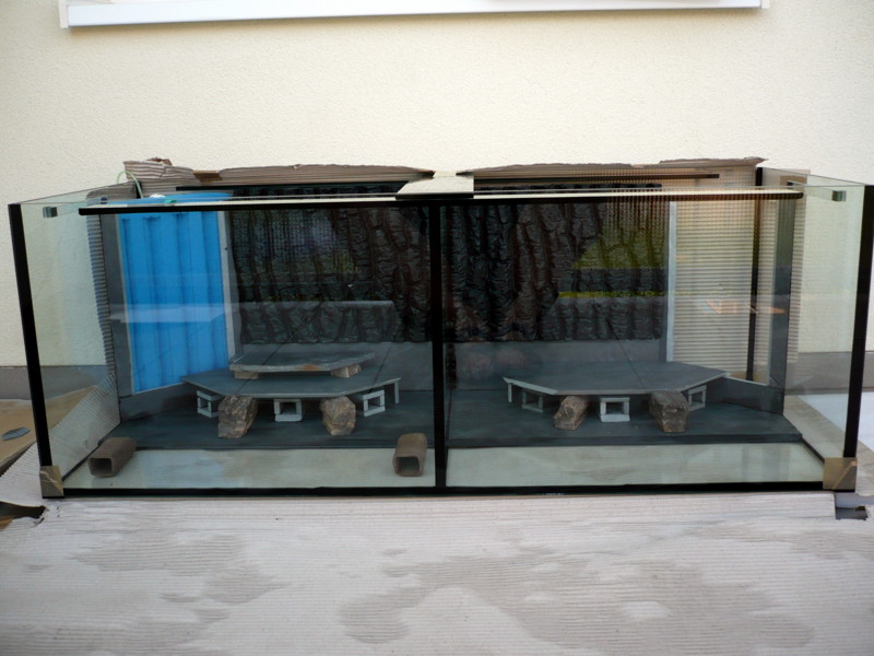 Dimensions: 120 x 50 x 44 cm devided by central separating wall to two smaller tanks (aprox two feets long, 1,66 width and 1,5 feet high, i.e. cca 30 US gal. netto) for two groups.