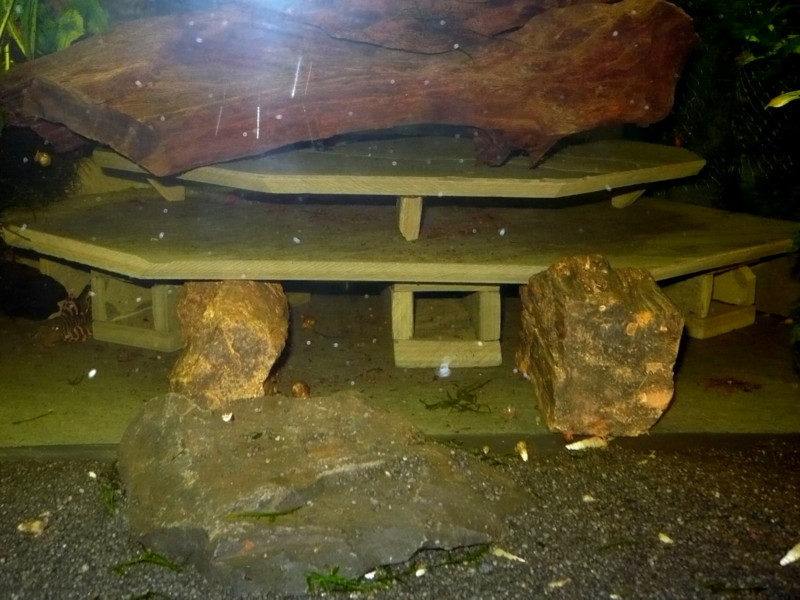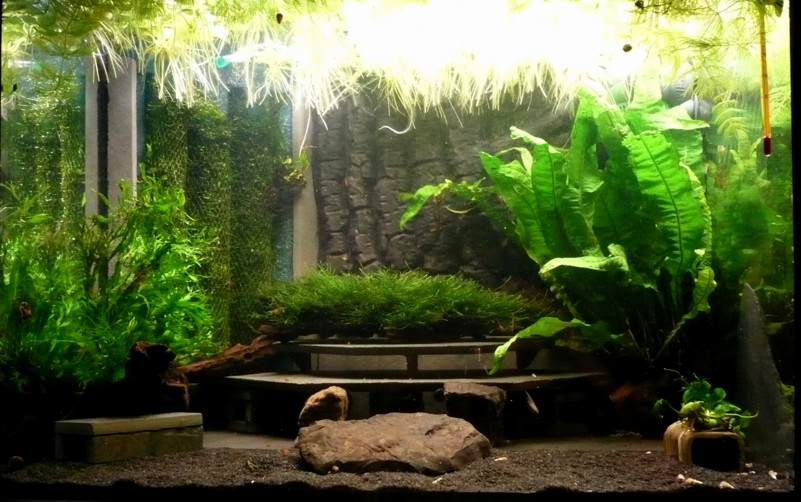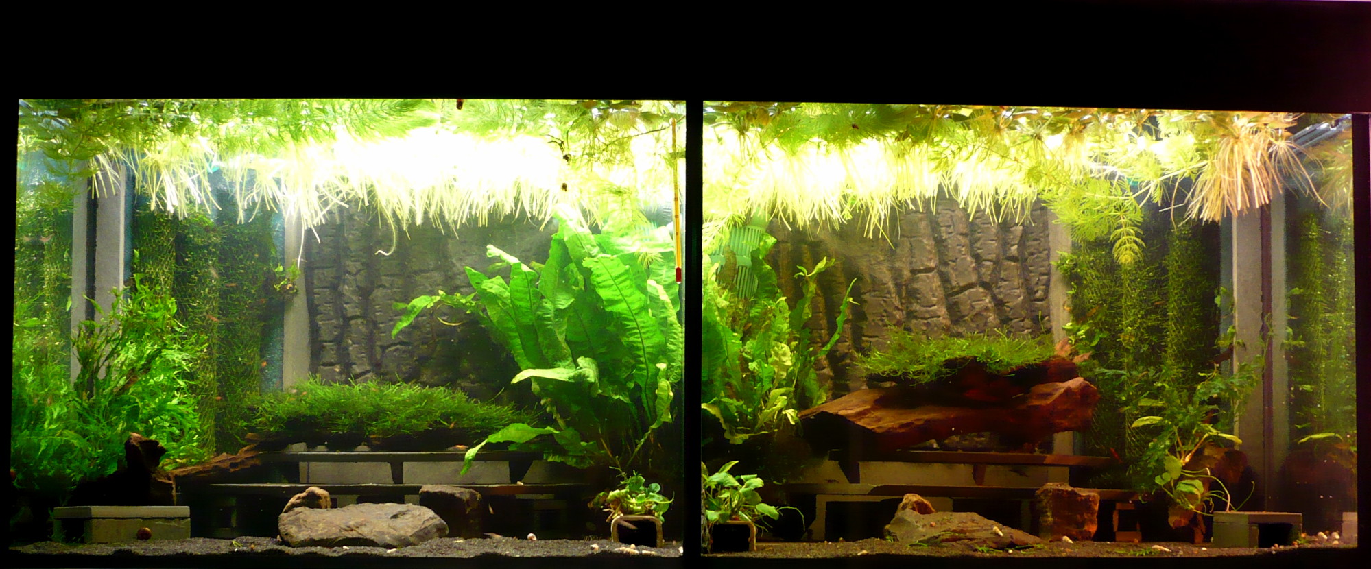 Bottom combined onepiece black slate and black sand, some slate and terracota caves (min 5 per each tank) and two levels of slate "floors" plus some woods coverd by java moos and java fern mostly with some small anubiases, surface is covered by floating plants (Limnobium, Ceratophyllum) so tank on bottom is rather dimmed...