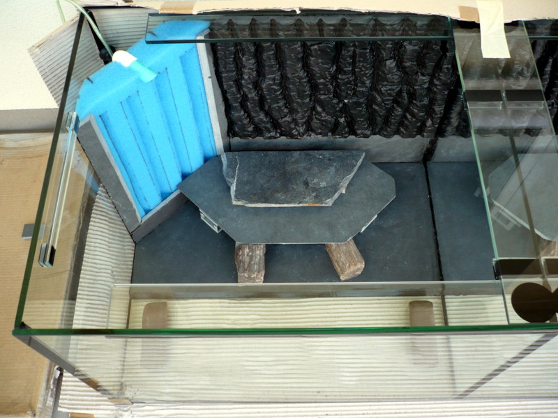 Rear wall is covered by slate (lower part) and Juwel STR above. (all fissures are well siliconed).