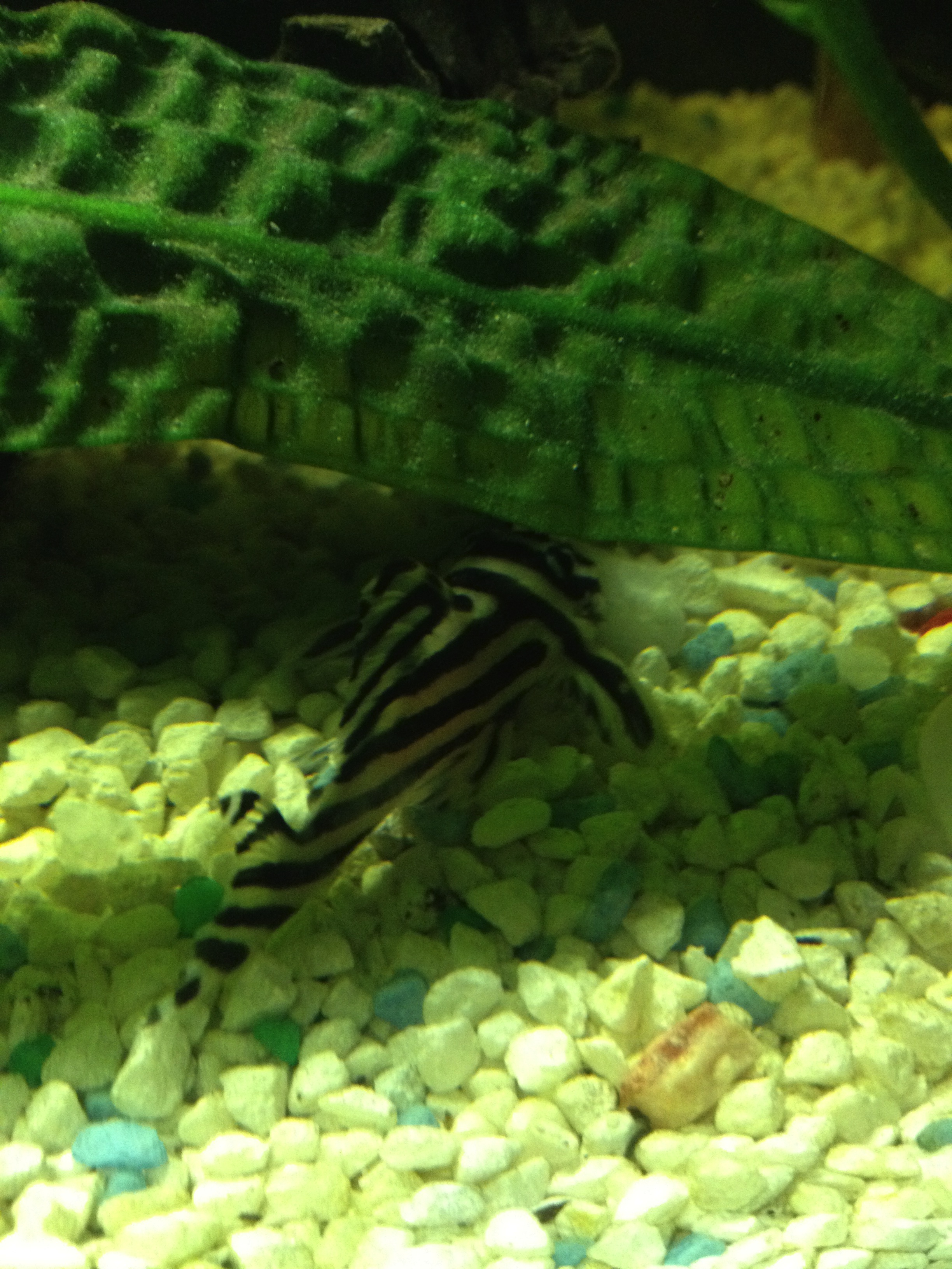 This is a quick pic of the Zebra Pleco I am rescuing from my friend's community tank. Once my tank has cycled I'll get it out of the tank he or she is in and take better pics. Not sure how old or if it can be sexed yet, but once there are pics from the top we shall see... I've never seen the little one eat, and never left the security of the driftwood.
